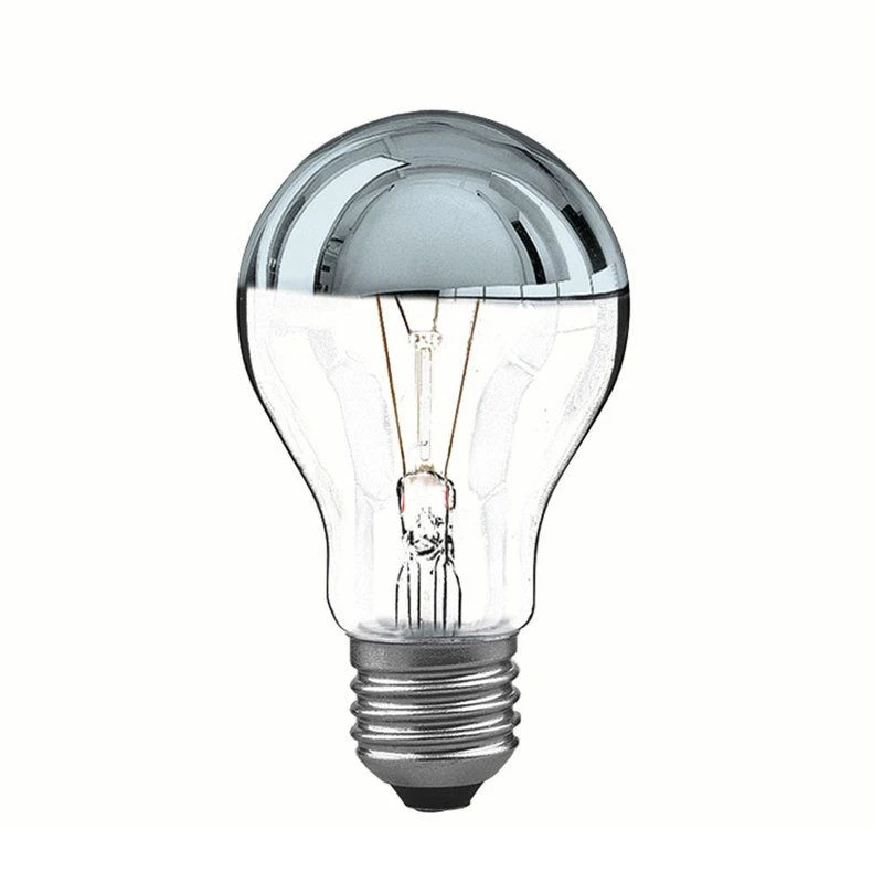 100W incandescent original tungsten version of the traditional pear-shaped A60 light bulb featuring a special crown silver finish which reflects light.