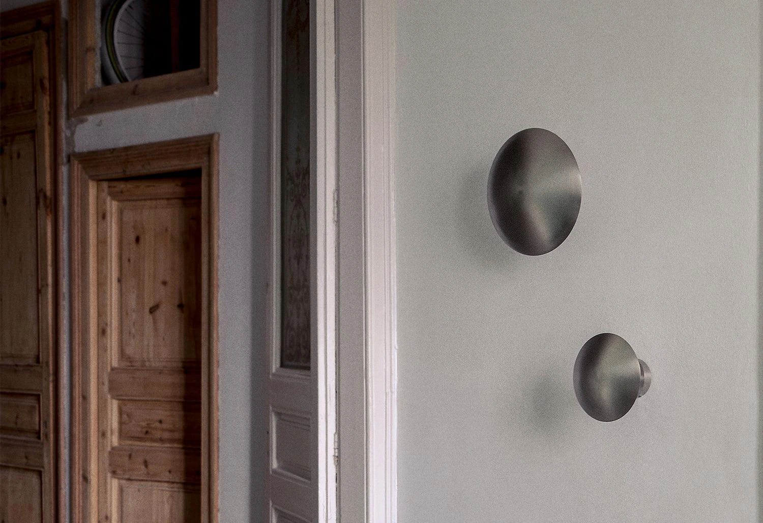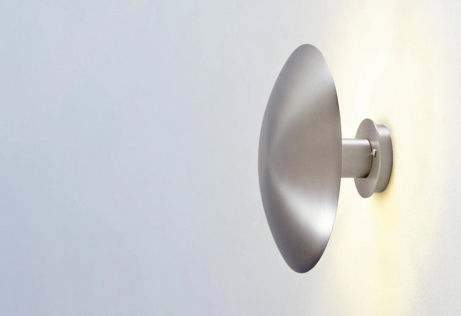 A disc of moulded steel hides the source of light while diffusing it around its opaque circle. The light reflects on the wall, creating a halo around the disc. Available in medium and large.