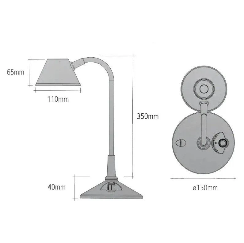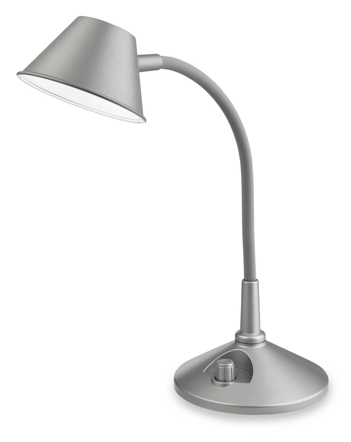 This table lamp is silver and comes with a rotating dimmer with on/off switch and LED indicator