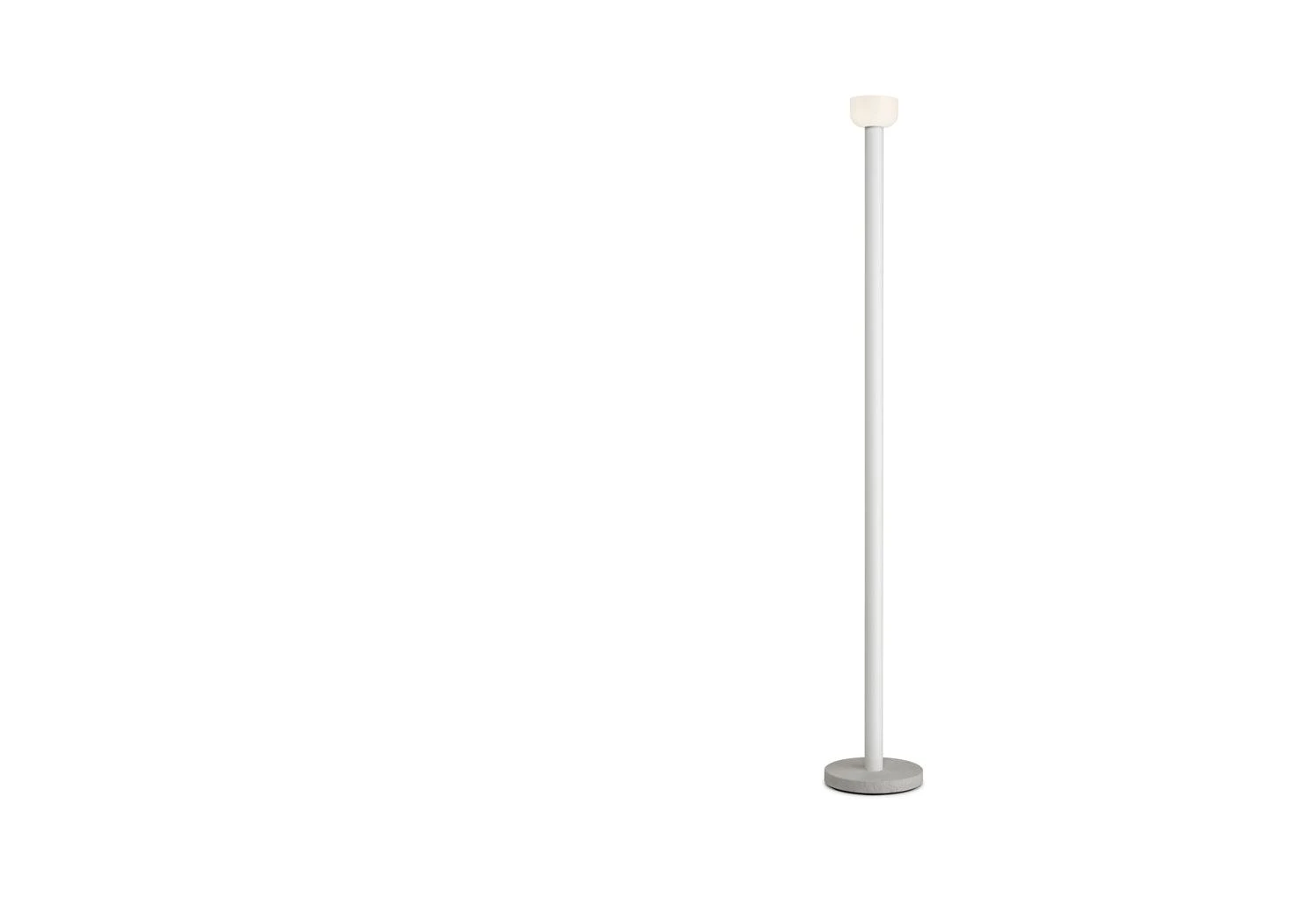 The Bellhop Floor lamp is the newest member of the Bellhop Family, by Barber Osgerby. Similar in form to the portable table lamp, the shade has instead been upturned and crafted in hand-blown opal glass, sitting upon a slender painted aluminium stem with a contrasting concrete base. The bold colour palette and selected materials visually referencing the Memphis design movement.