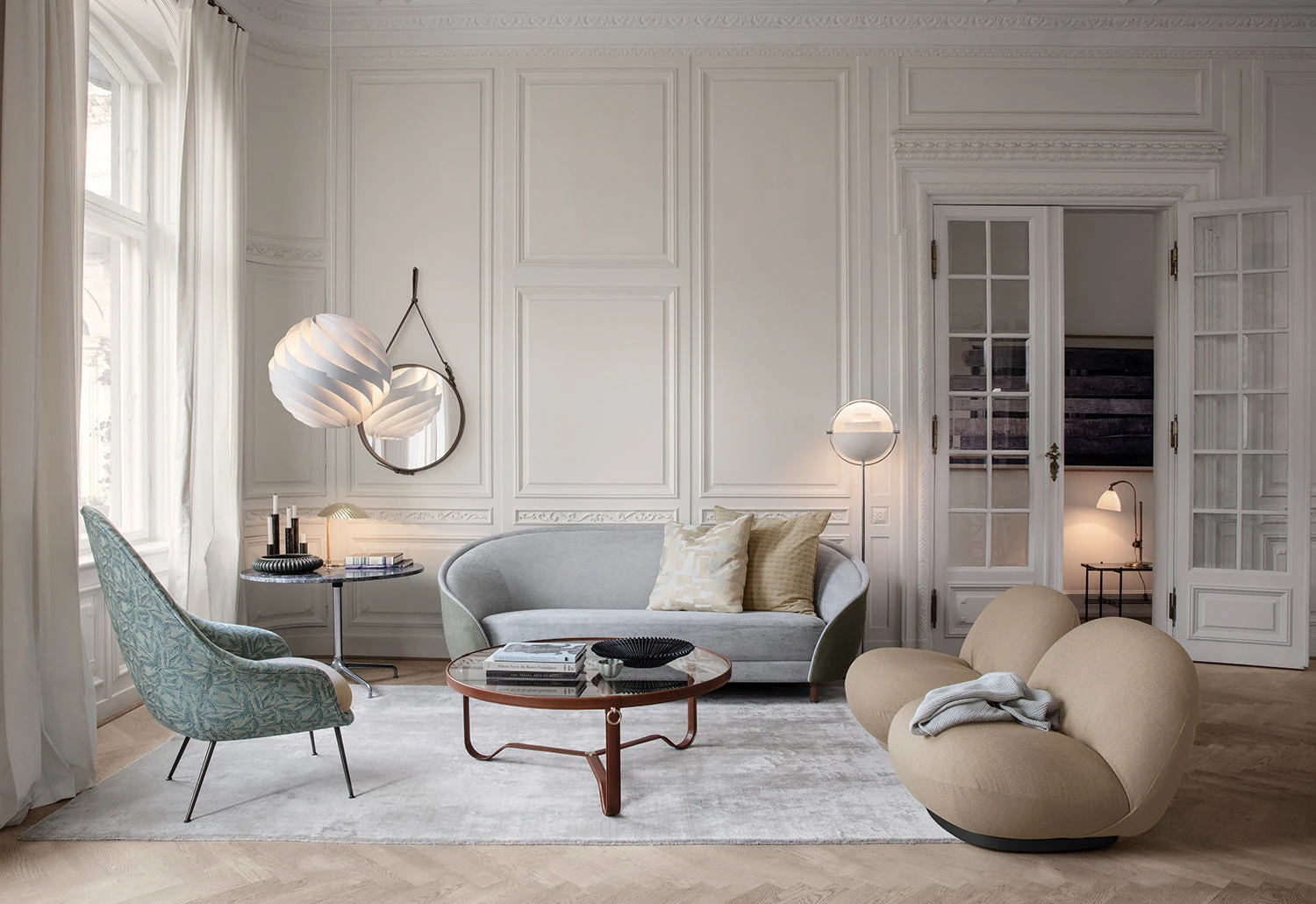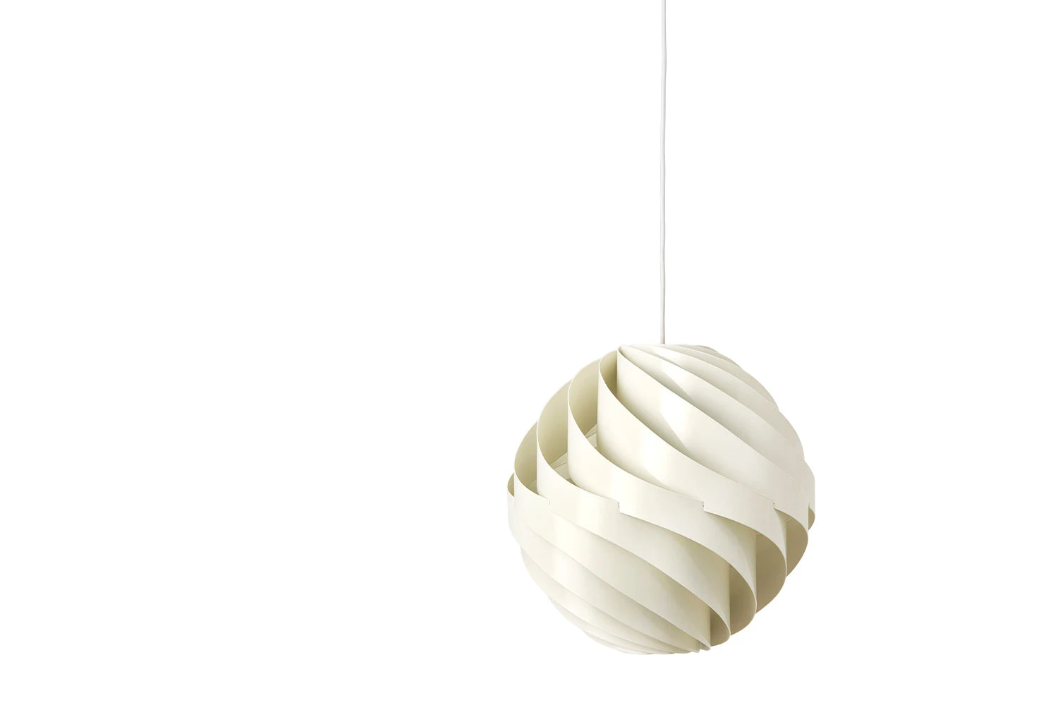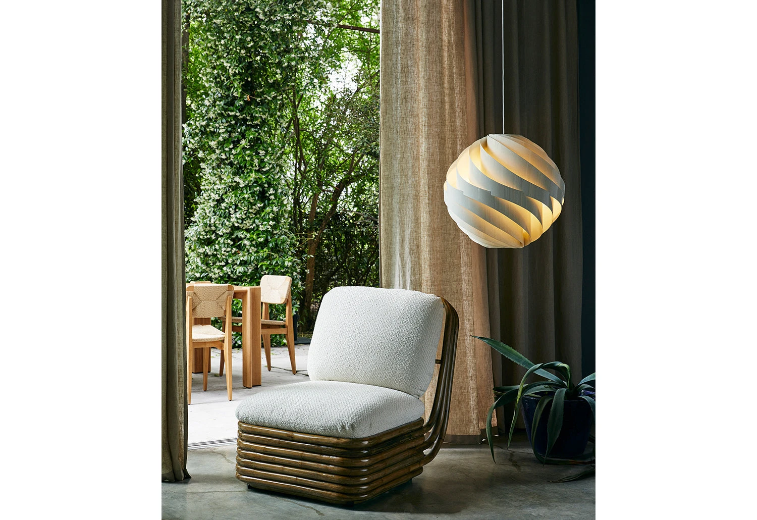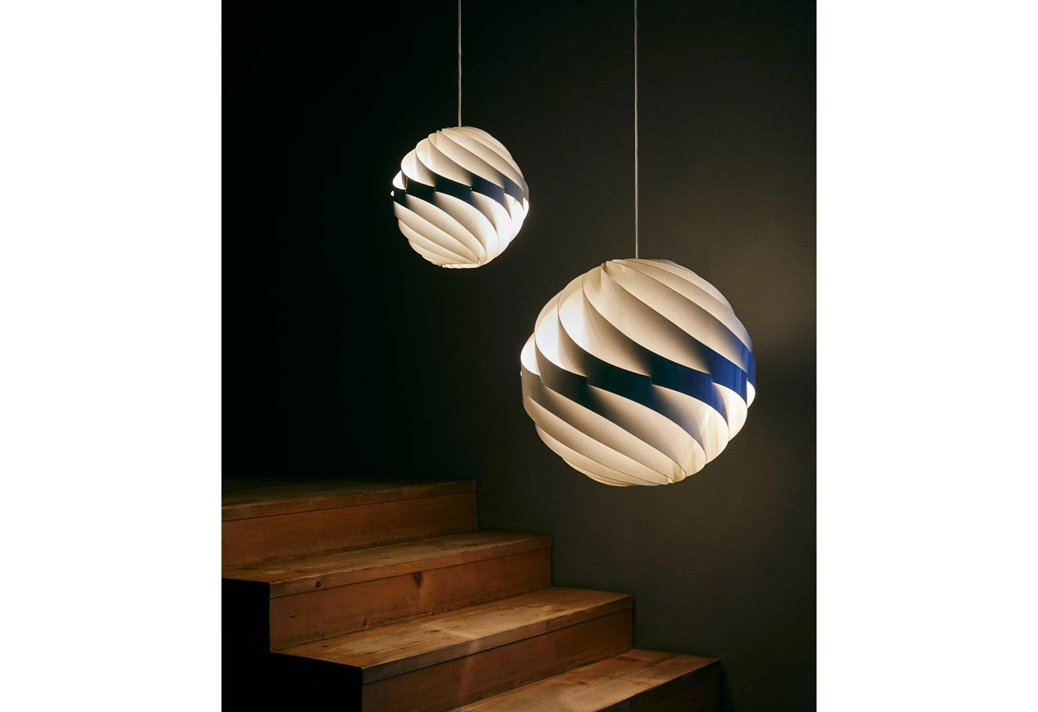 The design of the sculptural pendant was inspired by the lightness of the Japanese rice paper with Weisdorf transforming it into a more durable and sturdy version of the traditional lamp. The outer curve of the lamp is made of twelve similar spiral lamellae, that form a flower-like globe that shields the light.