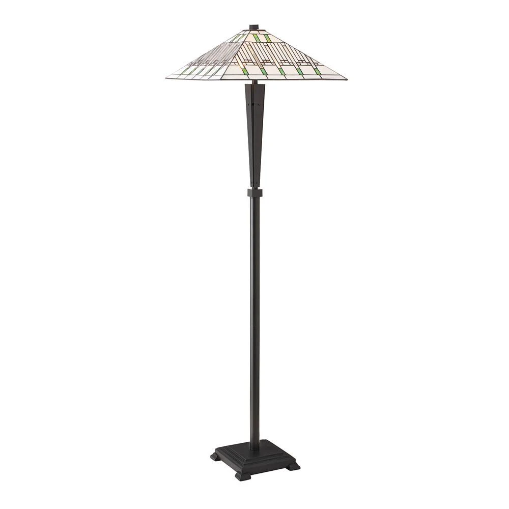 A striking floor light featuring the strong lines associated with the art deco period, in clear and cream Tiffany style glass with green highlights. Compatible with LED lamps