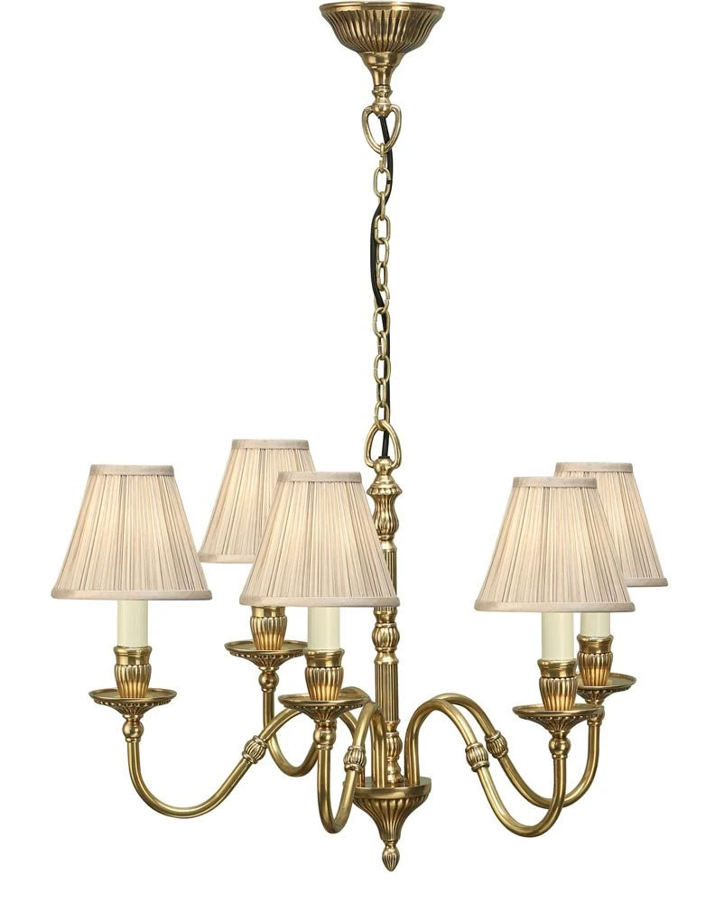 The Fitzroy 5 light pendant is a premium quality, solid brass fitting in a Georgian style with a decorative detailed finish. Comes with pretty, pleated beige organza effect shades. Matching items available
