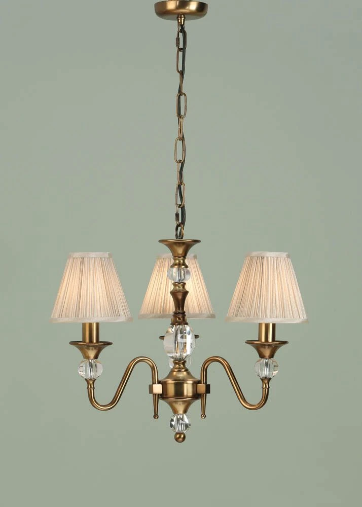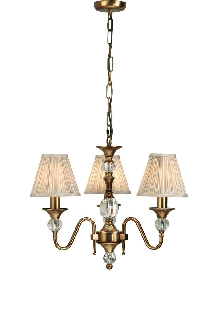 The Polina antique brass 3-light pendant is an elegant addition to any room. Finished in an antique brass plate and adorned with k9 crystal glass detailing and beige organza effect shades to give it an opulent feel