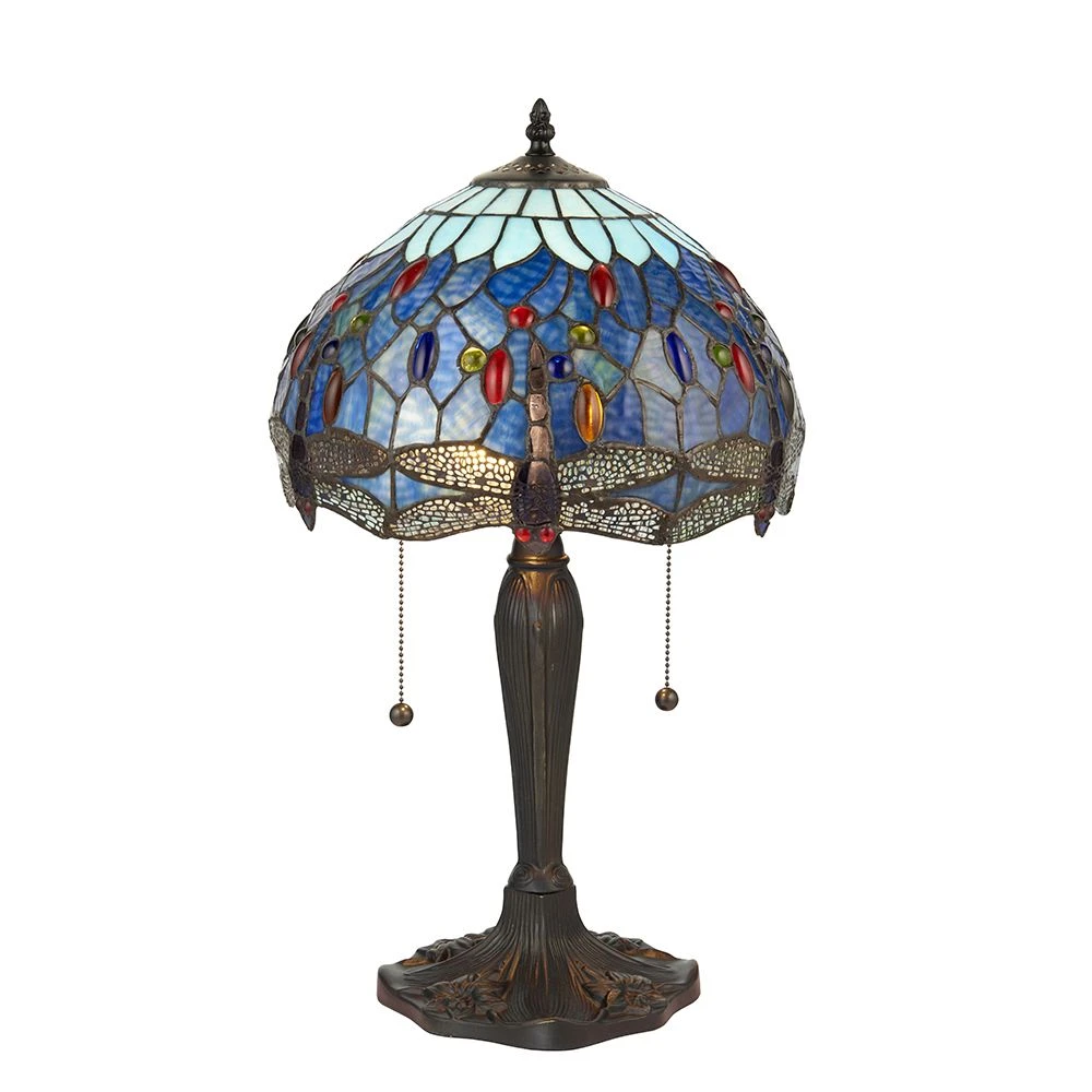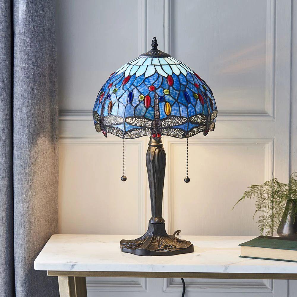 A stunning small table light with the iconic Tiffany Dragonfly design in a vivid blues with multi coloured glass beading. Teamed with a dark bronze effect fitting and compatible with LED lamps
