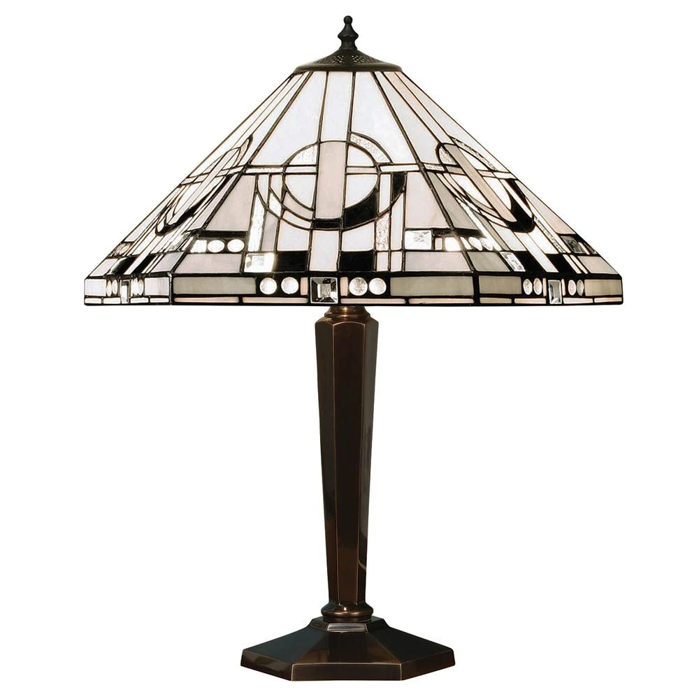 An eye catching art deco style table light in black, white and grey teamed with a traditional bronze effect fitting. Compatible with LED lamps