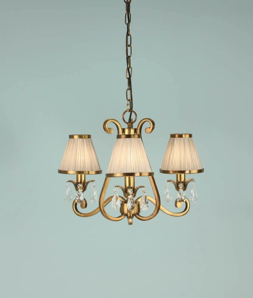 A 3 light pendant from the Oksana antique brass range. Features faceted lead crystal droplets and beige pleated shades with an antique brass trim. Matching items available and compatible with LED lamps