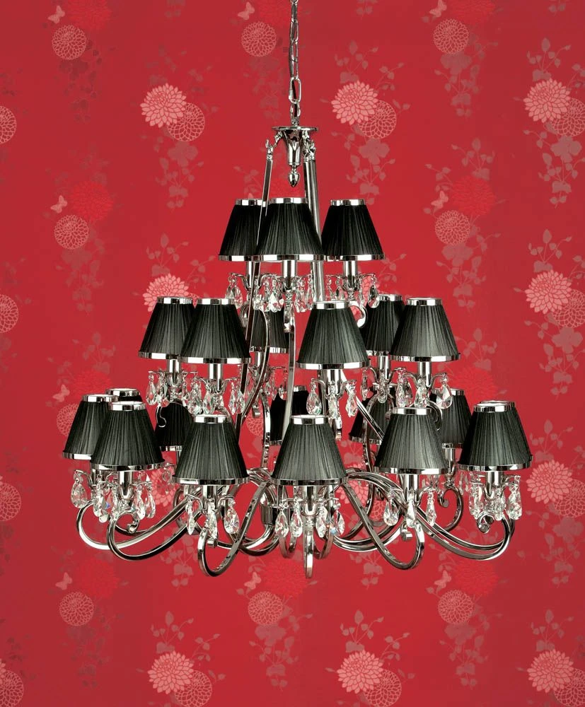 A 21 light pendant from the Oksana nickel range. Features faceted lead crystal droplets and black pleated shades with a polished nickel trim. Matching items available and compatible with LED lamps