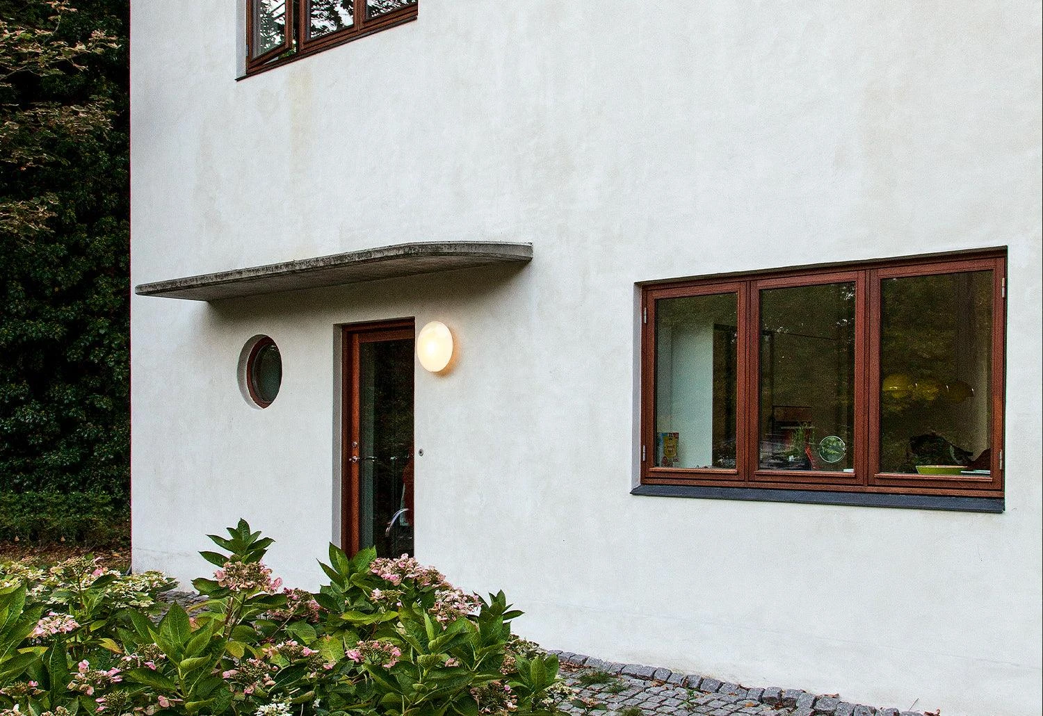 The AJ Eklipta outdoor wall light provides soft and comfortable lighting. The construction of the glass ensures an evenly lit surface. The three-layer mouth-blown glass shade has a clear edge, creating a halo of light around the perimeter.