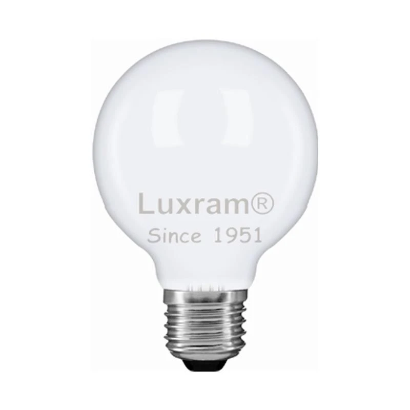 Luxram Lighting 80mm round opal globe shaped light bulb in 40-watt incandescent with a large Edison screw thread, 27mm base diameter. This lamp is compatible with dimmer switches, provides a soft warm white light and lasts on average 1,000 hours.