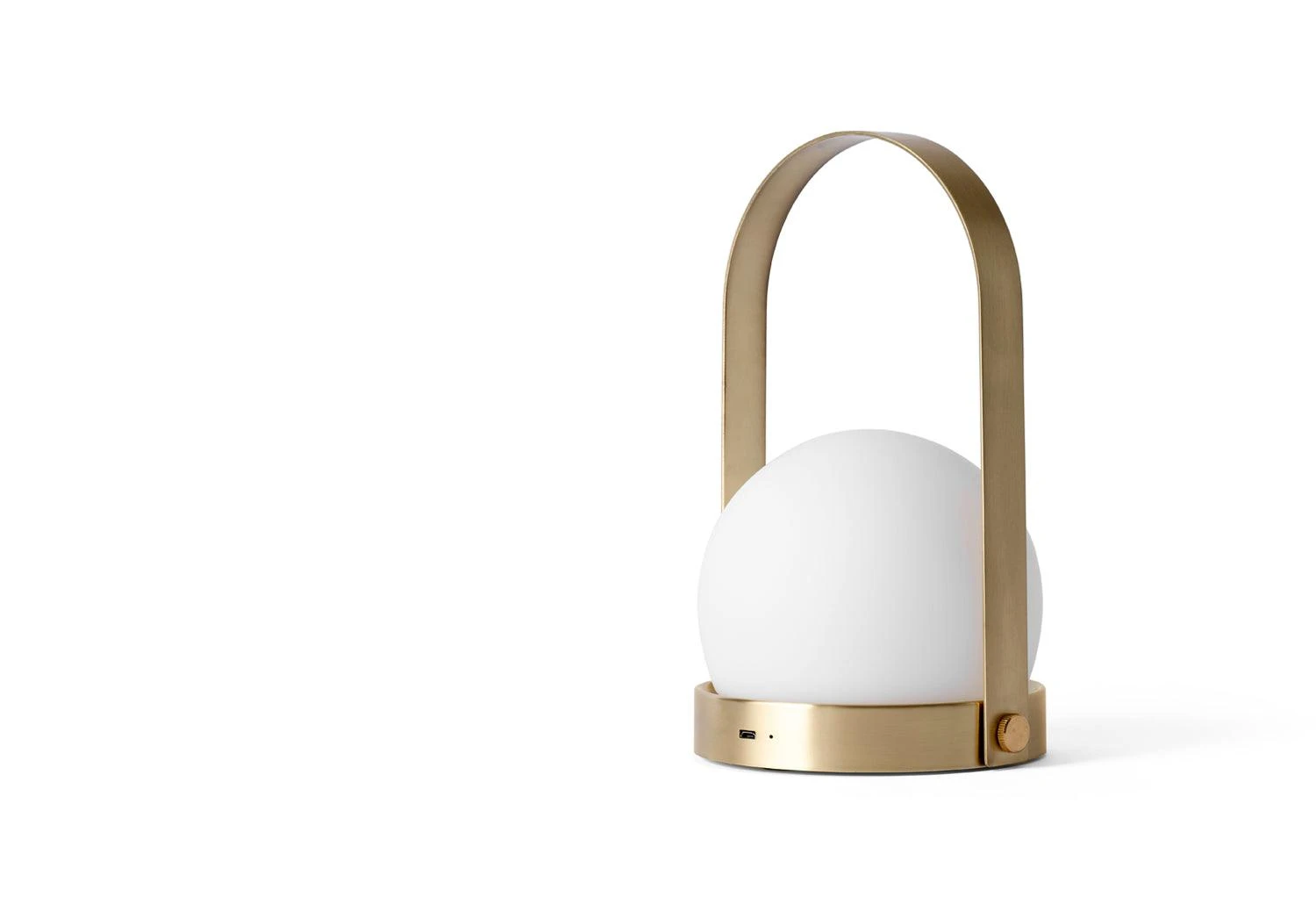 Its minimalist form is easy to use, with a small button to illuminate and dim, and a brushed steel or brass handle to carry it. Featuring a brushed brass body and an opal shade, the versatile lamp can be used as outdoor lighting, as a desk lamp or anywhere at home to softly illuminate any dark spaces.