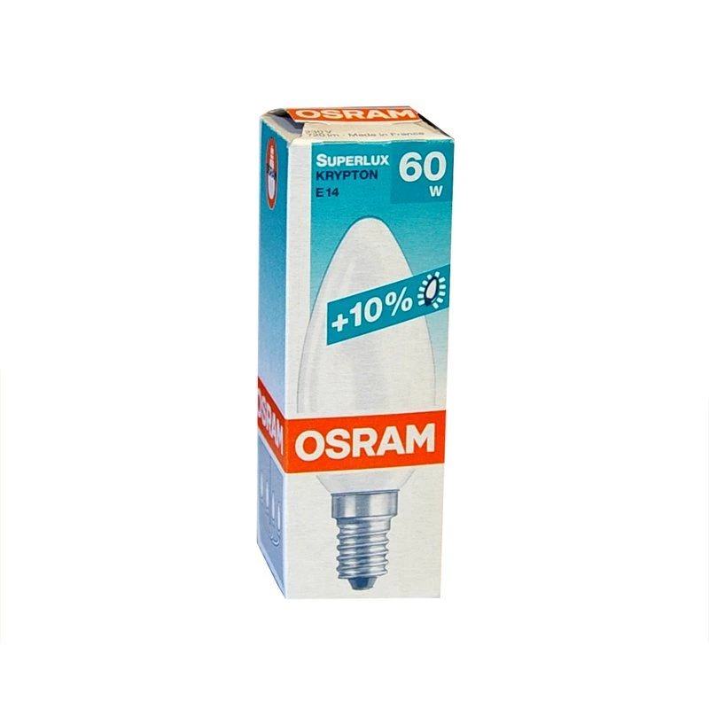Osram branded “Krypton” candle light bulb produces 10% more light than the average incandescent 60W.