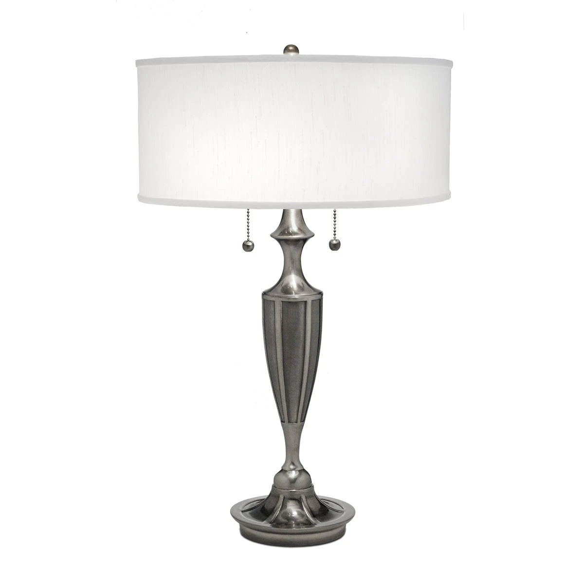 Zinc cast table lamp with Antique Nickel finish, including Global White shade.