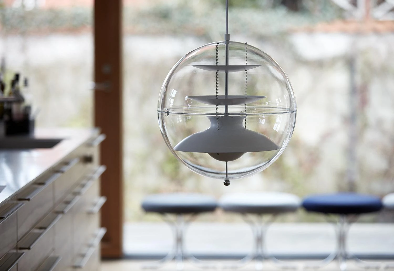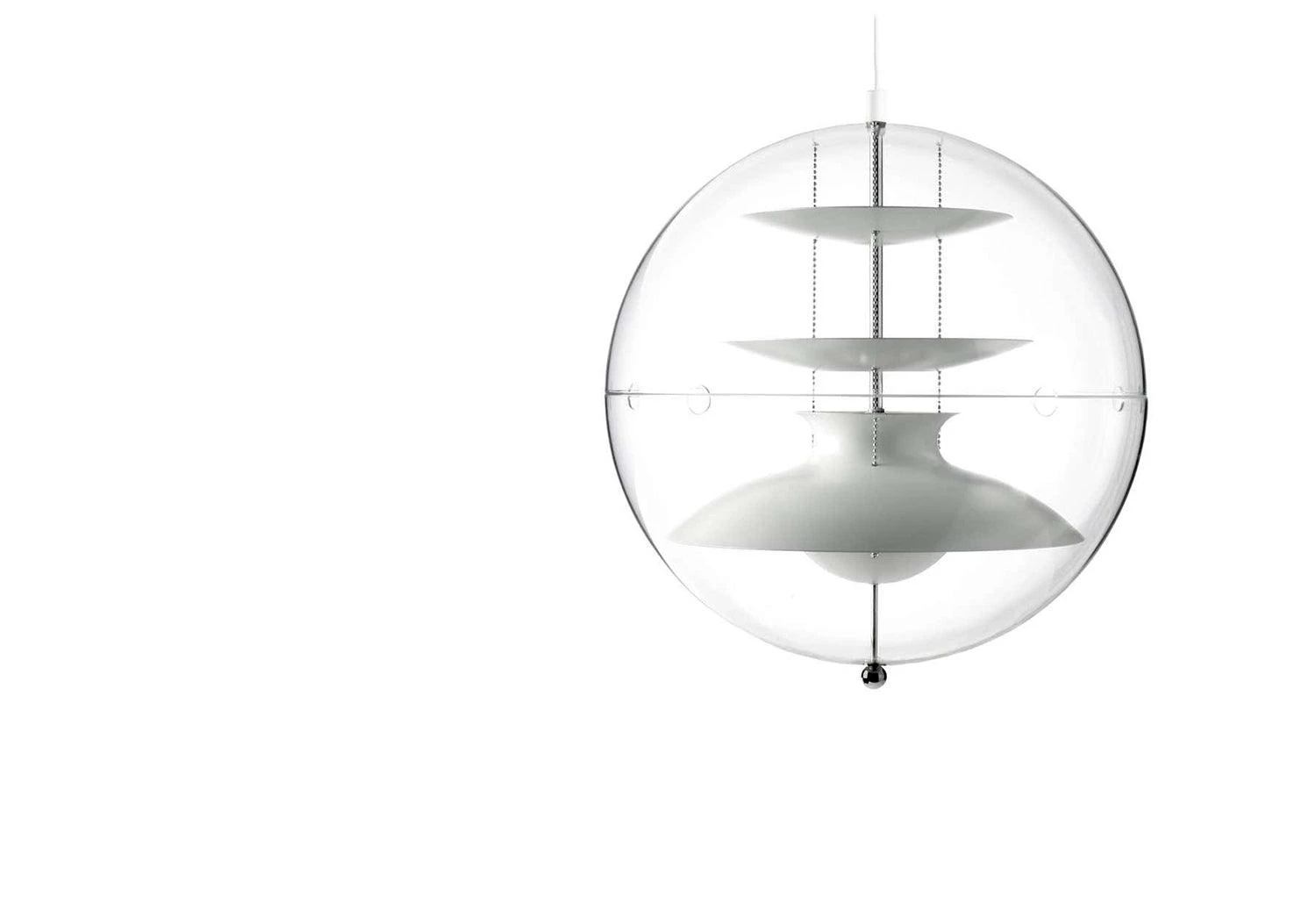 Transparent acrylic pendant lamp with white reflectors providing a soft diffused light.